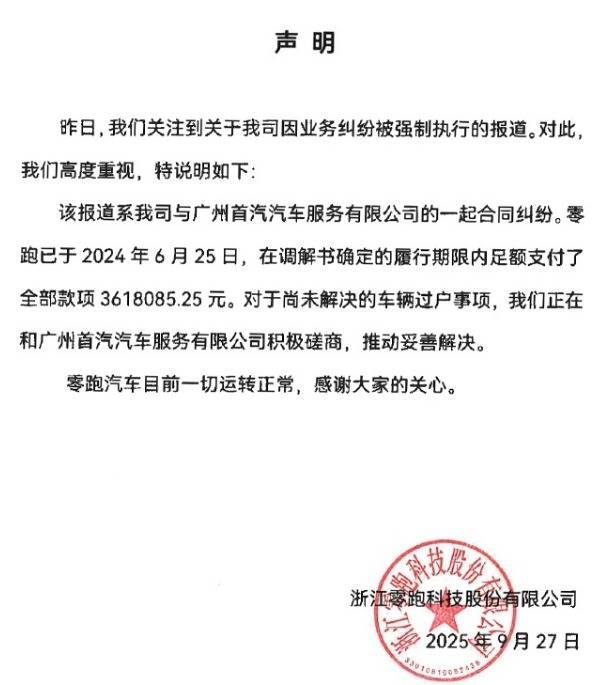 零跑汽车表示对此高度重视,并称该报道系与广州首汽汽车服务有限公司的一起合同纠纷。零跑汽车已于2024年6月25日,在调解书确定的履行期限内足额支付了全部款项约361.8万元。对于尚未解决的车辆过户事项,零跑汽车正在和广州首汽汽车服务有限公司积极磋商,推动妥善解决。